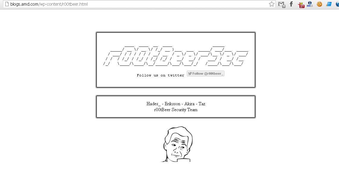 A team of Hackers called, "r00tBeer Security Team" today hack into official blog of Advanced Micro Devices (AMD) which is a American multinational semiconductor company. AMD is the second-largest global supplier of microprocessors based on the x86 architecture and also one of the largest suppliers of graphics processing units.
