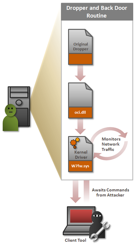 According to experts from security firm Symantec, it all starts with the unknown dropper which installs a DLL backdoor onto the compromised device. This backdoor then installs the driver component that allows the attacker to communicate with the infected computer.